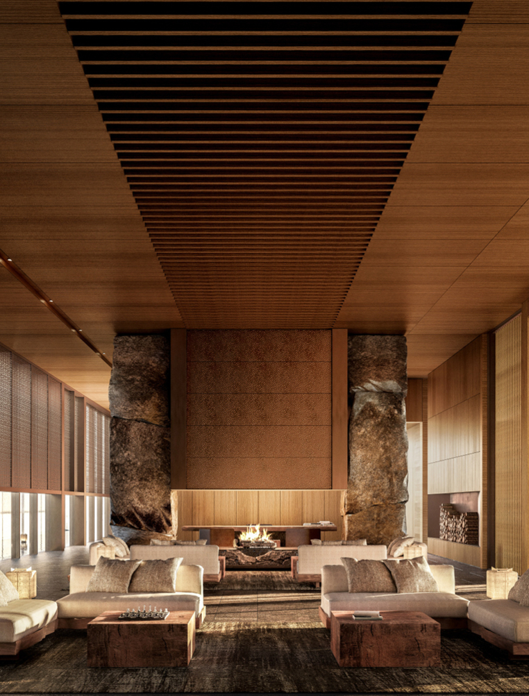 The main pavilion forms the social heart of the property, housing two restaurants, a bar, whisky and cigar lounge, private dining room, library, boutique and gallery, alongside dedicated ski facilities for seamless winter living. Thirty guest suites are located in a separate pavilion, each positioned to capture uninterrupted mountain views.