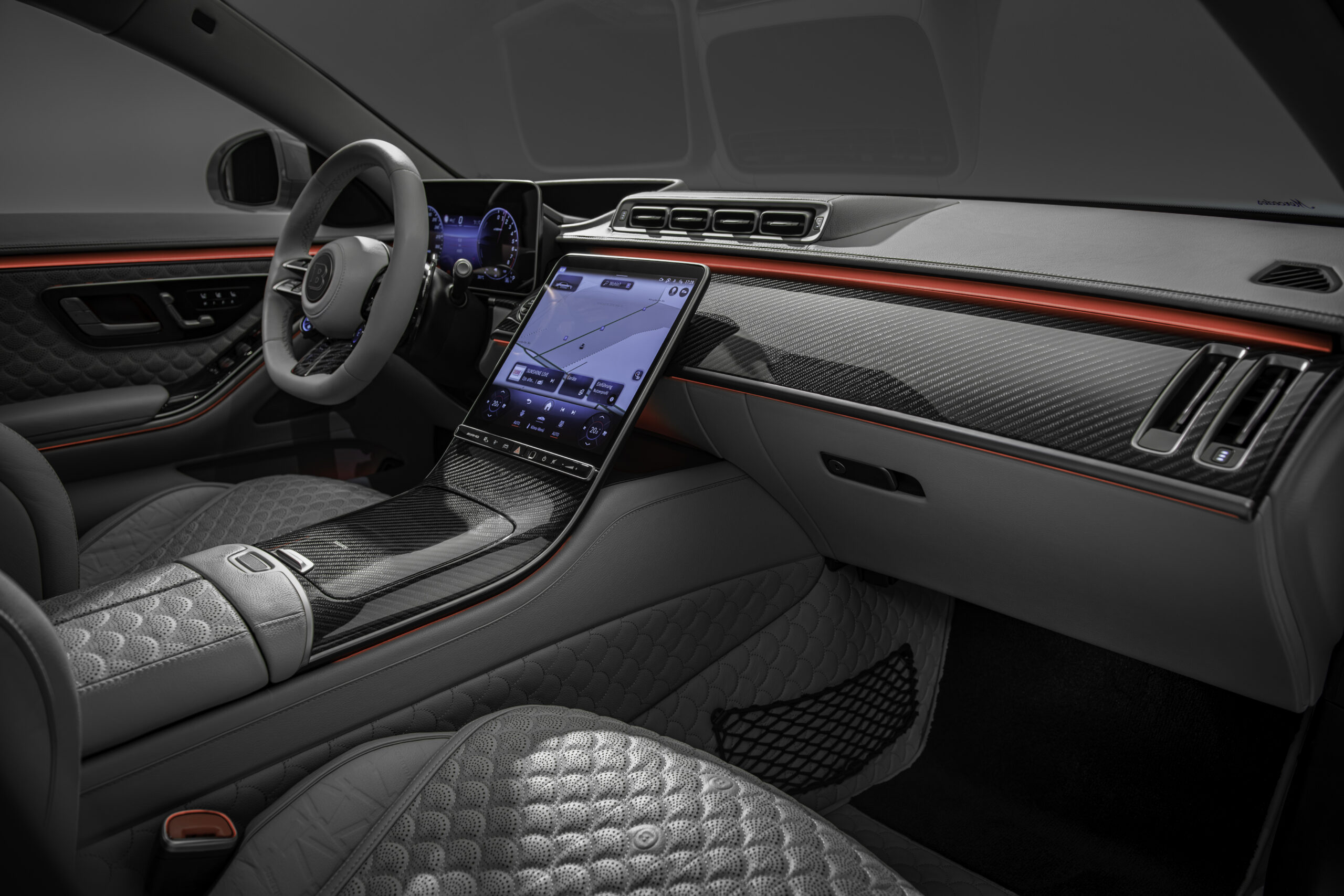 Like all BRABUS MASTERPIECE interior appointments, it is the precision with which all work was carried out that is fascinating in the 1000 ALL GRAY as well. This includes the quilting and perforation of the seat surfaces, center consoles and door panels in shell pattern design with embossed ‘Double-B” logos. The floors of the vehicle interior and the trunk are made from the finest leather and are adorned by the same pattern. The seat side bolsters as well as the inner sections of the door panels commemorate the founding of BRABUS in 1977 with the “Heritage” brand pattern featuring embossed “77” logos.