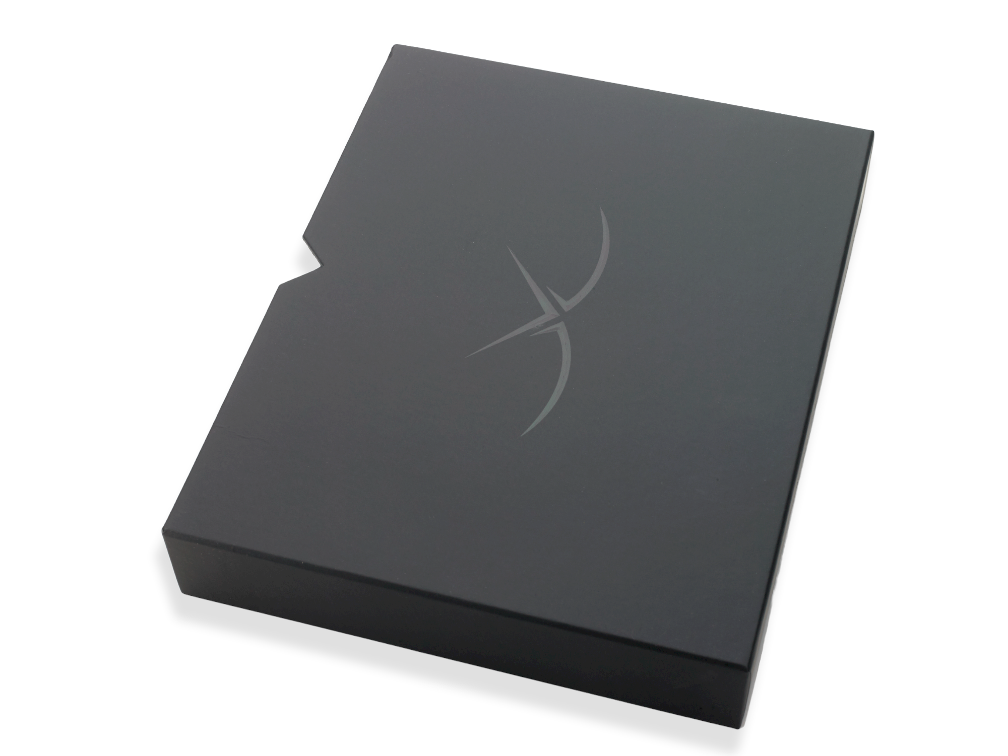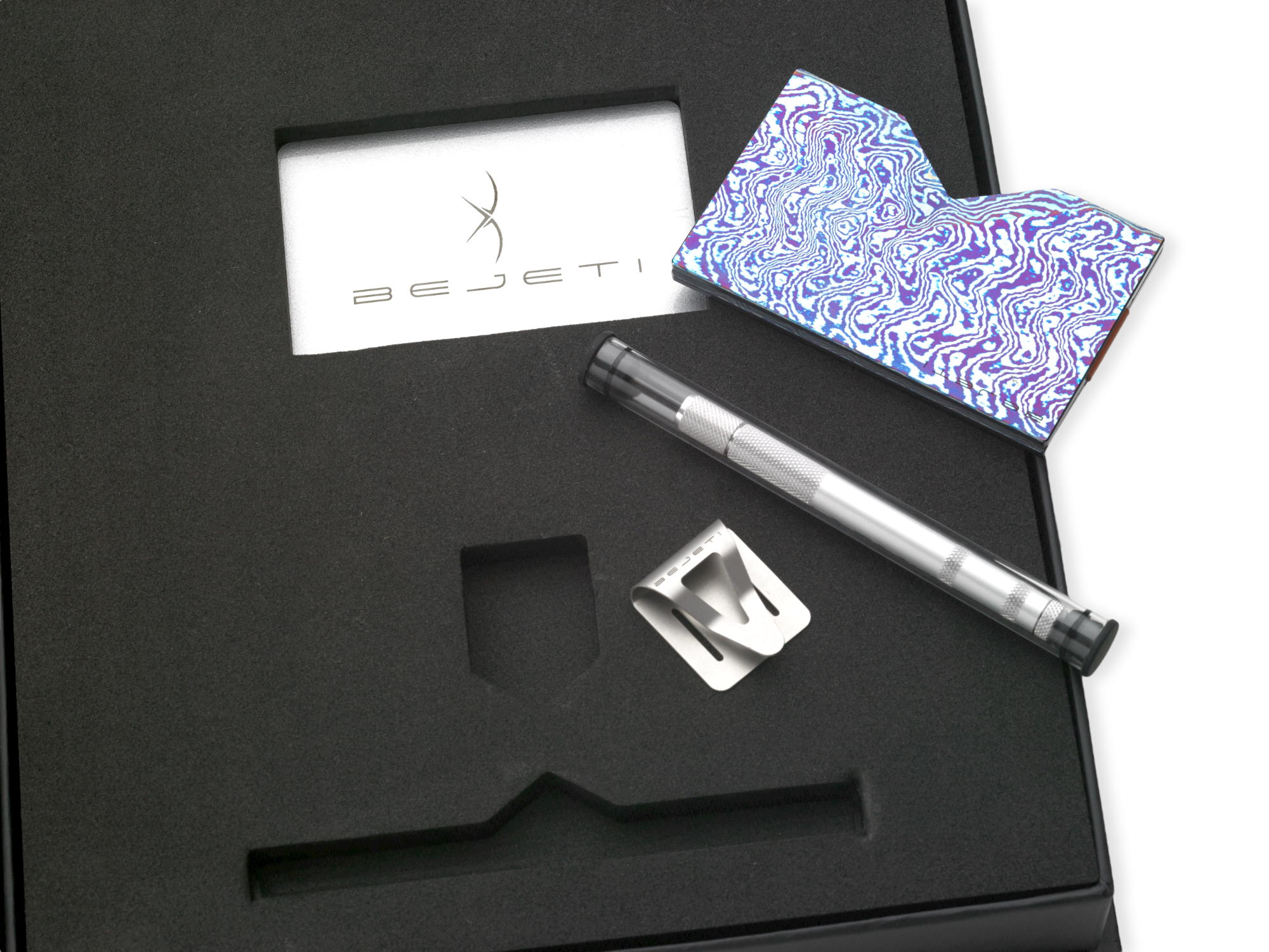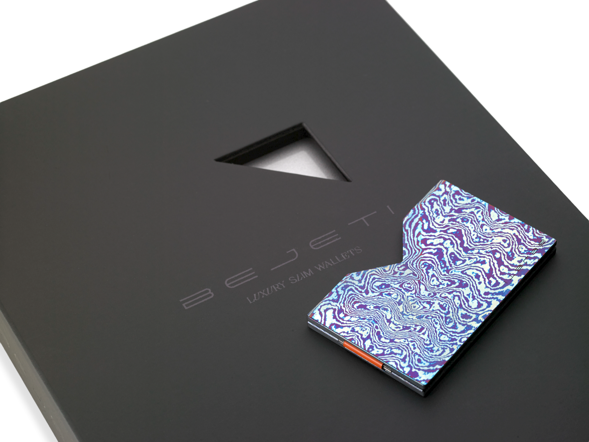 The result was a subtle yet elegant slipcase and book folder design in matte black with the iconic Bejeti logo and other design elements in gloss black. The matte black Bejeti slipcover has the brand logo on the front and the name along its spine. Incorporated into the slipcase are triangular cut-outs to complement the Bejeti wallet’s triangular thumb relief. The Bejeti brand name is prominently displayed on the book folder, with a triangular cut-out window that offers a glimpse of the extraordinary wallet’s material. Upon opening the 3-panel folder, the wallet is fully revealed with a congratulatory note. Nestled below the wallet are the accompanying money clip and star screw driver made in the USA.
