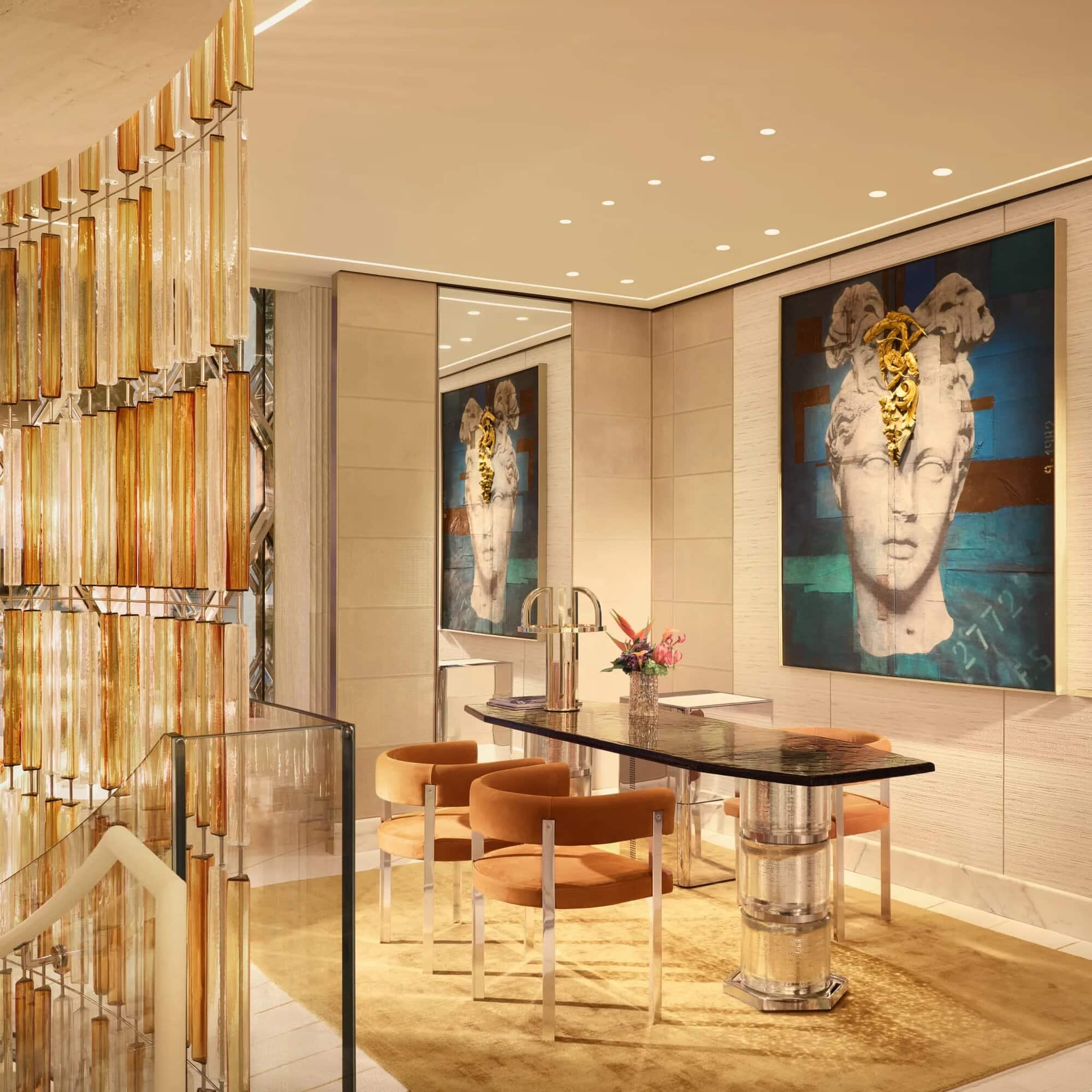 A striking staircase installation forms the visual centrepiece of the interior. Created with Italian glassmaker Venini, the structure is composed of more than 1,400 individual glass elements suspended in cascading amber tones, creating both an architectural feature and a sculptural focal point within the boutique.