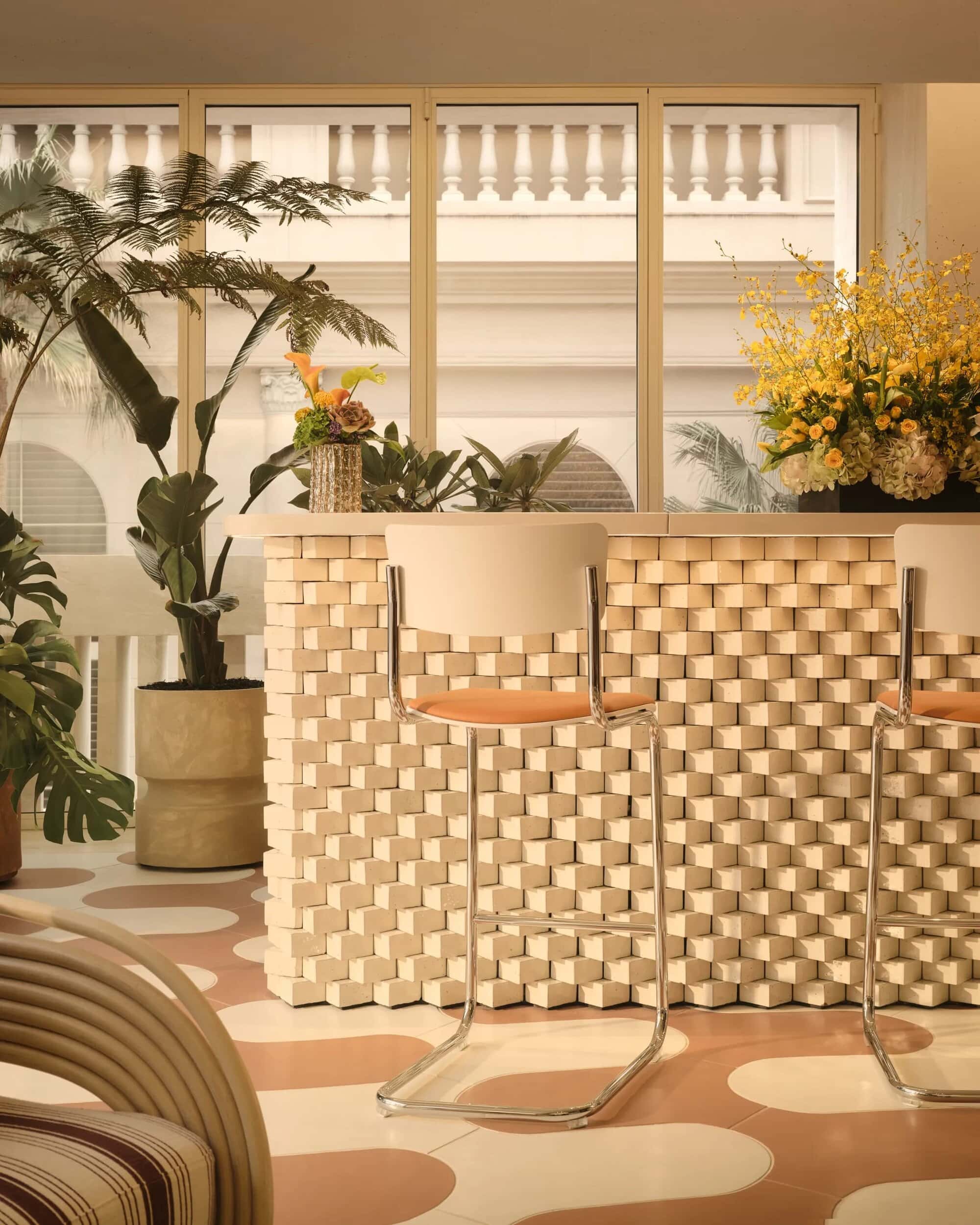 Inside, the boutique blends the house’s Roman heritage with contemporary Californian elegance. Travertine columns, fluted walls and amber toned finishes reference materials associated with Bulgari’s Roman roots, while curved marble display tables and open salons introduce a softer, more residential atmosphere.