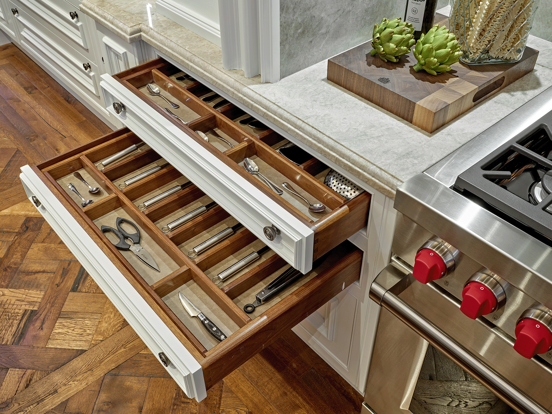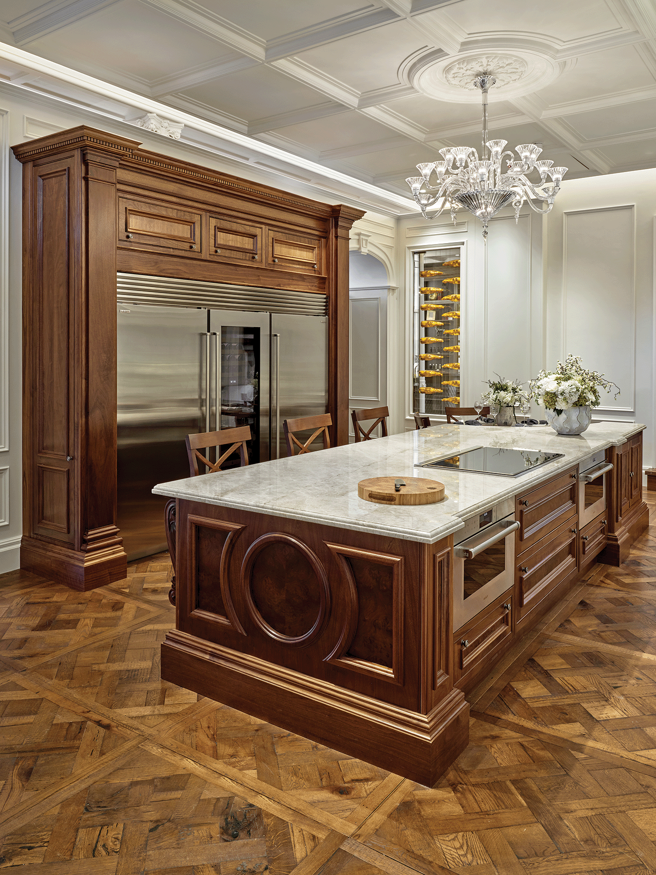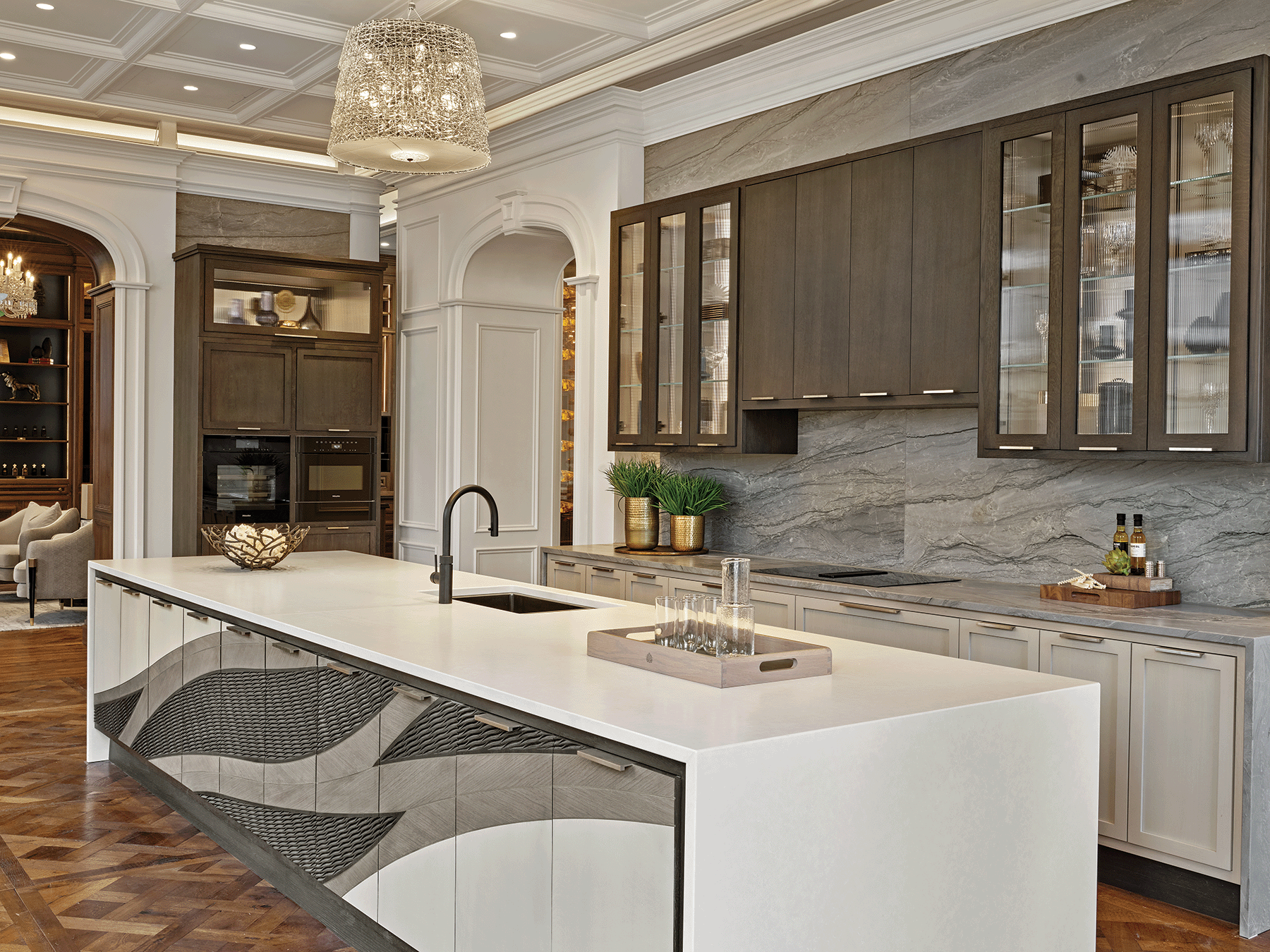 On arrival, clients are presented with two Clive Christian Interiors kitchens. The recently launched OPUS in ‘Ethereal’, which is the first iteration of this new kitchen in Europe, welcomes design connoisseurs and dazzles them with its four-metre island, swirling Cosentino stonework and exquisite inlay marquetry. Miele appliances and Kaleo units are seamlessly integrated within the functioning kitchen, which is finished with Blum Hardware and Joseph Giles ironmongery, providing a contemporary backdrop for cookery demonstrations and future events.