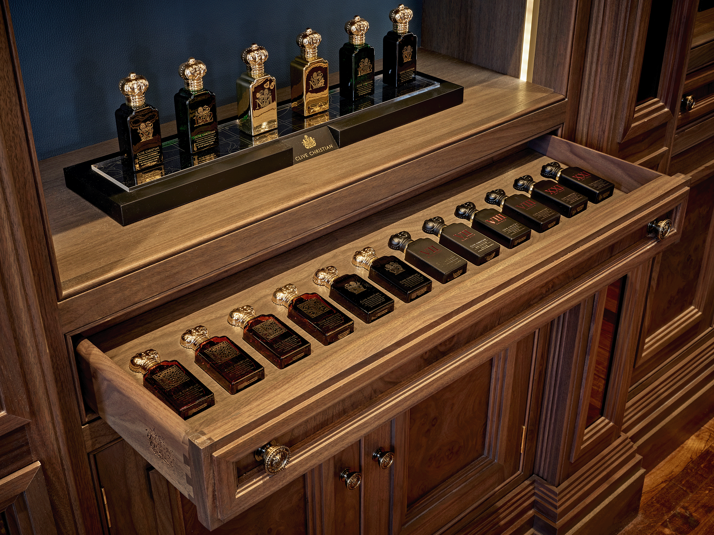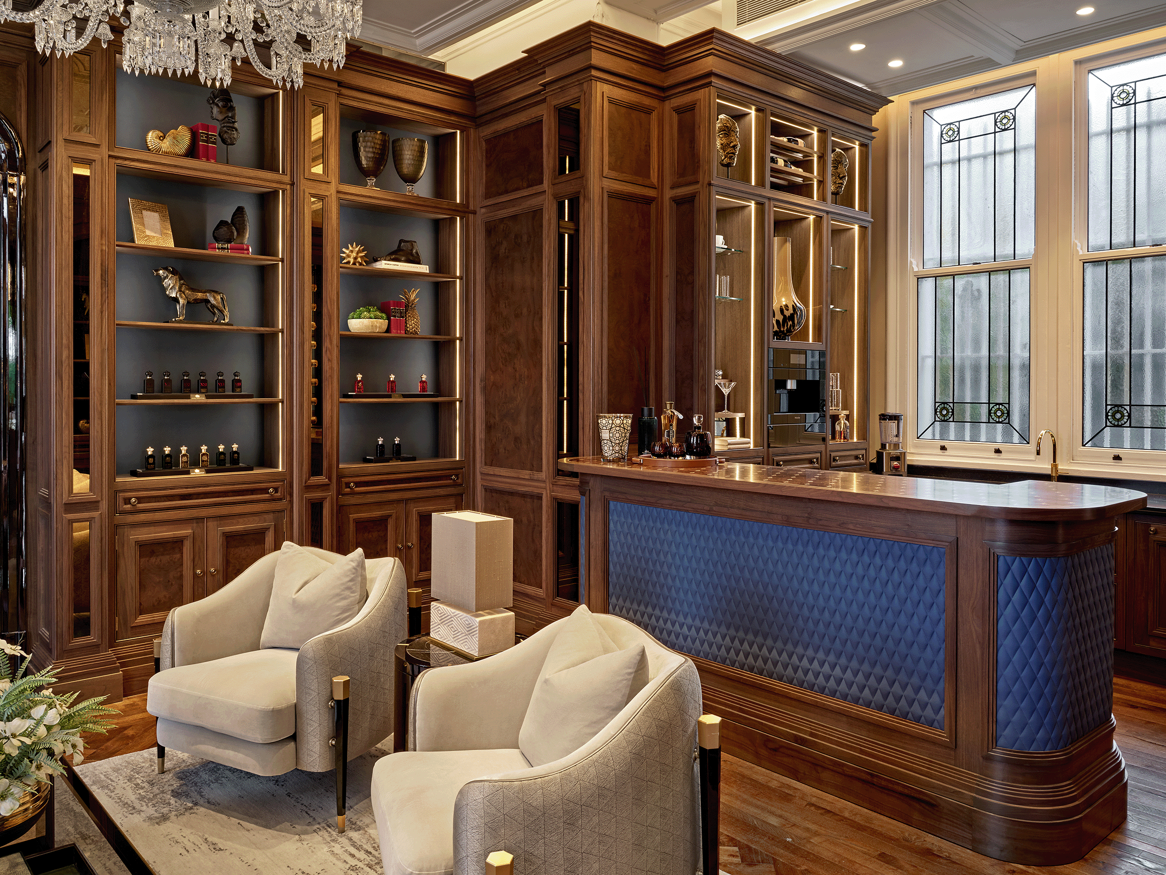 Completing the ground floor is the Senate Bar Lounge, which comprises a fully-panelled library and a working bar with Sub Zero & Wolf utilities. Playing on the original architecture of the building, the double-tiered library shelves are crafted from smoked walnut, lined with soft leather and used to display both books and iconic Clive Christian Perfumes from the archives. This space offers comfort and relaxation thanks to Dorya furniture and ambient lighting. Clive Christian Interiors have showcased their acute attention to detail throughout this space with the statement bar top which features a diamond pattern set within walnut burr and a quartersawn walnut surround: the very finest in marquetry techniques.