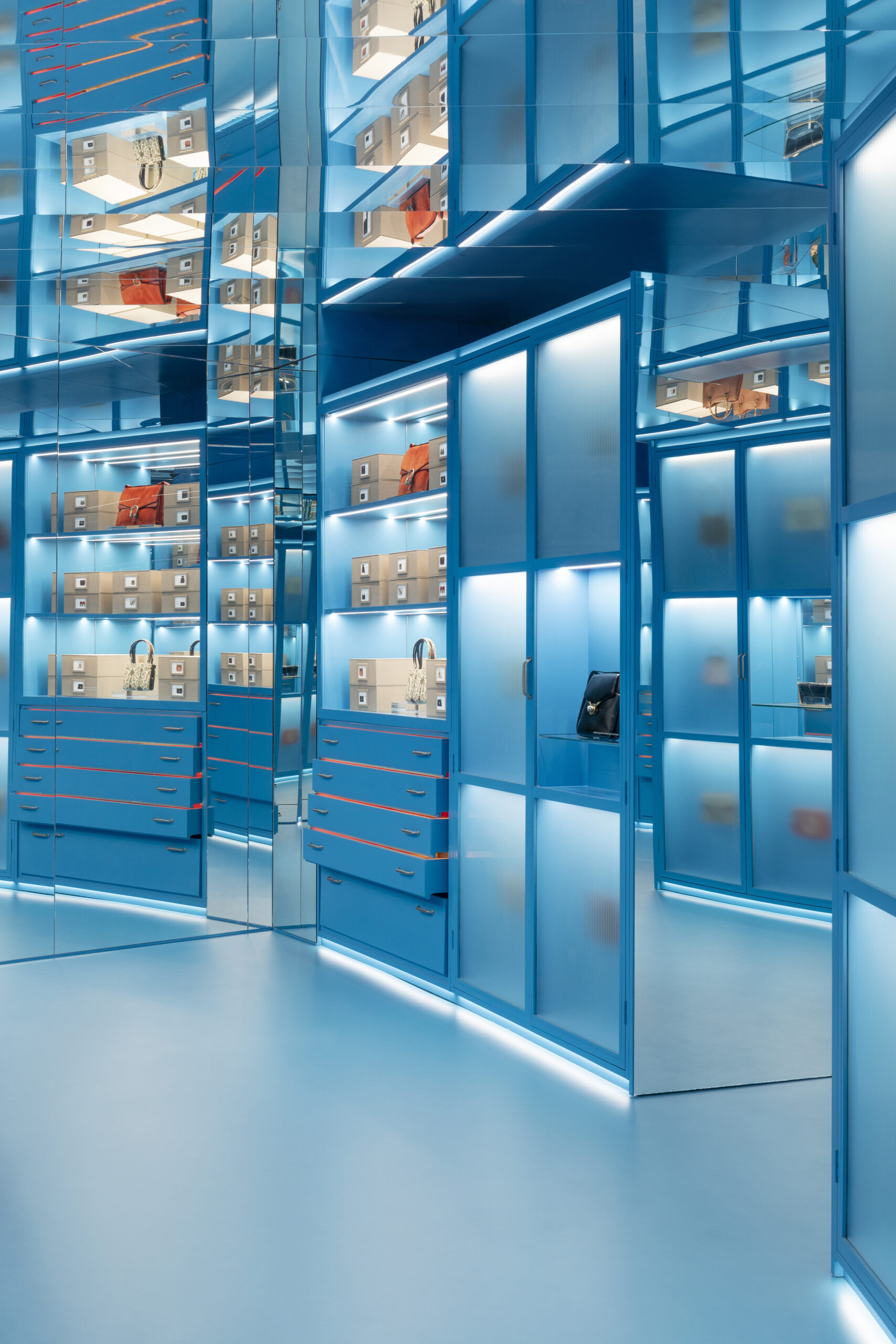 To enter the ‘Archivio’ world of Gucci Cosmos is to explore the origins of the House’s most iconic bags in a breathtaking space with a mirrored ceiling that creates a feeling of infinity. This maze-like world is reminiscent of the Gucci Archive in Florence and has walls lined with a multitude of cabinets and drawers. The historic bags on display include those now considered modern, yet timeless classics: the Bamboo 1947, the Jackie 1961, the Horsebit 1955, the Gucci Diana, and the Dionysus. The versions within the ‘Archivio’ world encompass a rare and colourful 1960s hemp interpretation of the Guccio Gucci-designed Bamboo bag, alongside a revisited leather version from the 1990s; an early example of the Jackie bag, featuring its signature piston clasp and Web stripe, as well as a late-1970s update featuring the legendary GG pattern. Also on show are a red leather bamboo-handle tote from the early 1990s that Alessandro Michele reimagined as the Gucci Diana in 2020, and two bags bearing the GG logo: an early-1970s style in black leather defined by its rounded version of the signature Interlocking G emblem, which inspired the Gucci Blondie first presented in 2021, and the debut GG Marmont in white matelassé leather, designed by Alessandro Michele in 2016. Rounding out the selection are handbags by Sabato De Sarno for Spring Summer 2024 including a Jackie Notte, a bucket bag with snap-hook closure and Web strap, and a patent leather Bamboo 1947 – all in the new signature Rosso Ancora shade of red. Alongside the cabinets, visitors can continue their archive dive by exploring drawers containing reproductions of illustrations by Vittorio Accornero de Testa, artisans’ sketchbooks and technical drawings, and vintage advertising campaigns.