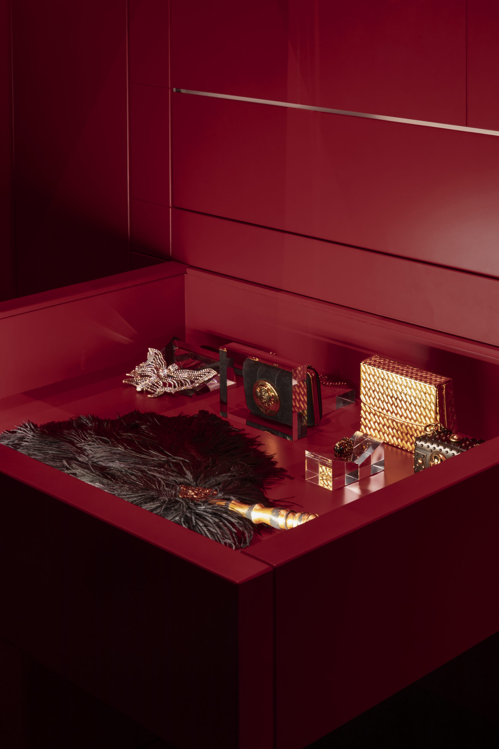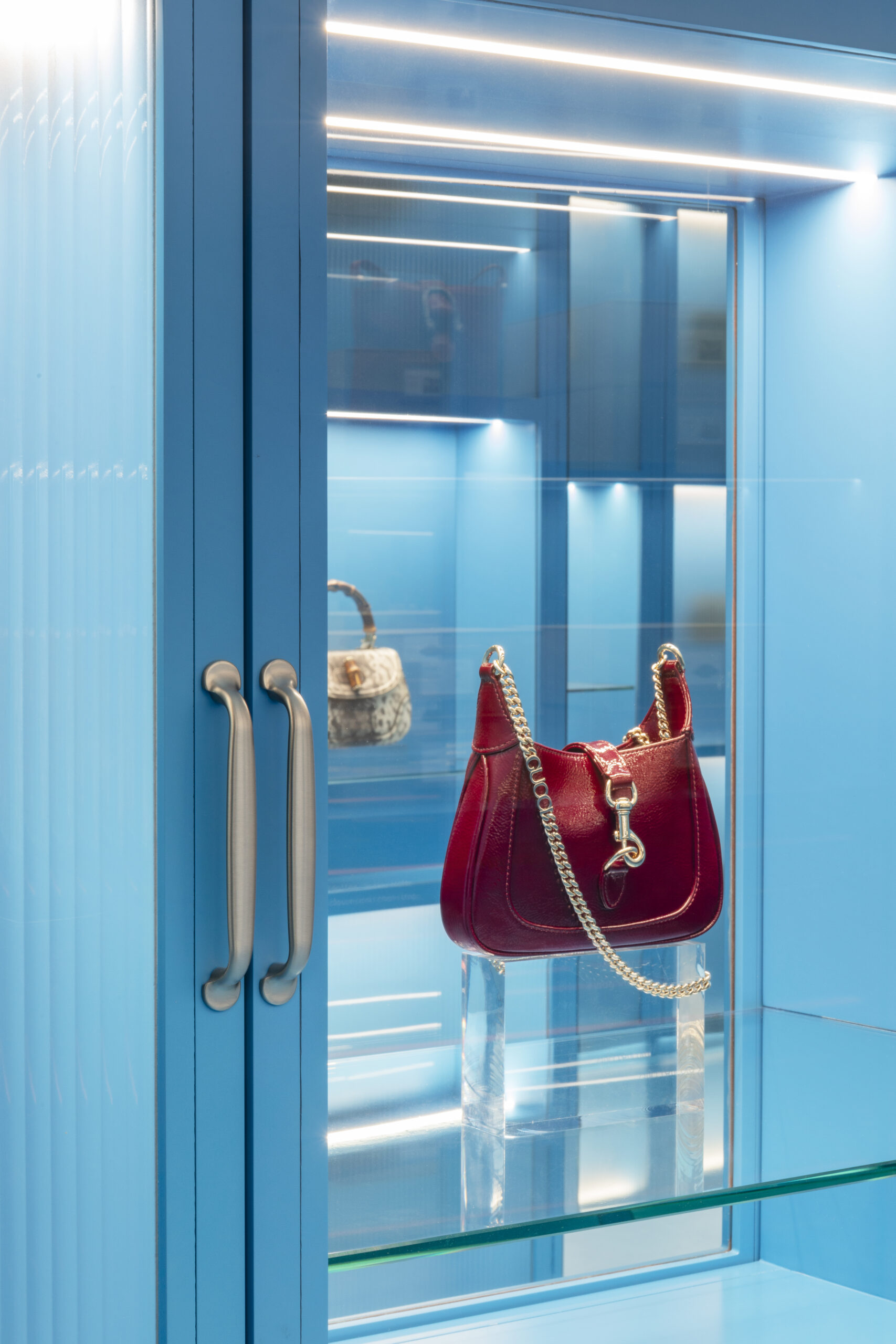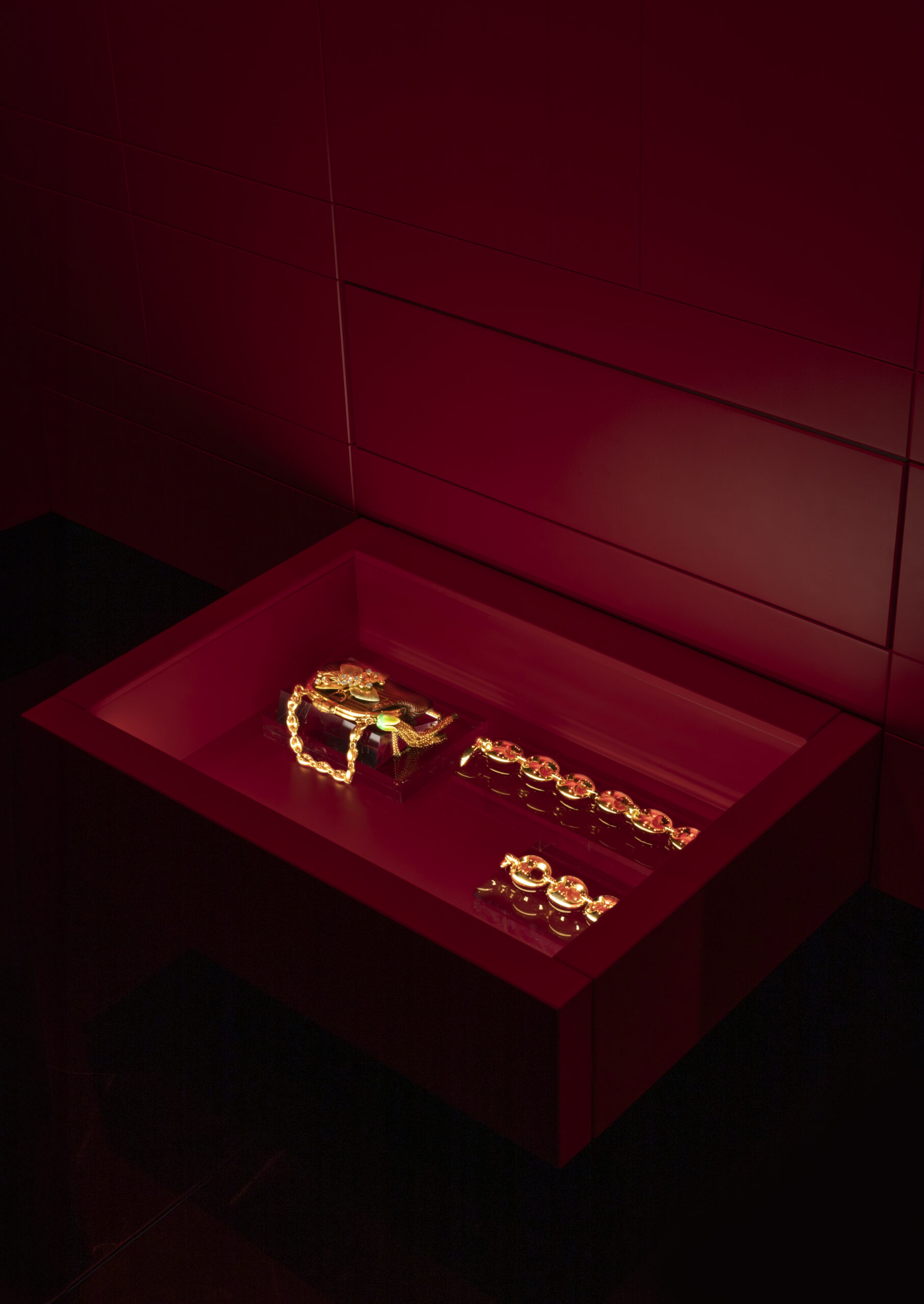 At the centre of the circular ‘Cabinet of Wonders’ world sits a rotating cabinet of curiosities. Three metres high, this stunning monolithic cube covered in deep red lacquer is filled with drawers and compartments that mechanically slide in and out – accompanied by a sound installation that accentuates and multiplies the sound of the cabinet’s mechanical movements – to reveal a wildly eclectic collection of garments, accessories and curios. Showcasing the full breadth of the House’s design range, it contains everything from a Tom Ford 2001 collection look with a black leather bustier to a 2006 Frida Giannini golden evening gown and GG velvet bag with metal and rhinestone handle, as well as a punk-inspired spherical leather bag with metal spikes from 2019 by Alessandro Michele and a crystal-embellished Jackie Notte bag from 2023 by Sabato De Sarno. Also present is a selection of singular jewellery spanning over six decades all the way to pieces from Sabato De Sarno’s recently-unveiled Marina Chain collection inspired by iconic archival styles from the late 1960s, alongside animal-shaped metal objects from the early 1970s inspired by the English countryside, and a Tom Ford-era electric guitar. The room also features a look worn by Harry Styles from Coachella 2022, an outfit worn on the Met Gala red carpet by Sinéad Burke, and a lamé bomber inspired by a stage look worn by Sir Elton John reinterpreted by Alessandro Michele for his Spring Summer 2018 collection. Like a symbol of Gucci’s free-spirited heart, ‘Cabinet of Wonders’ is a testament to the House’s unending flair for transforming the unexpected into objects of beauty and for audaciously following wherever inspiration may lead.