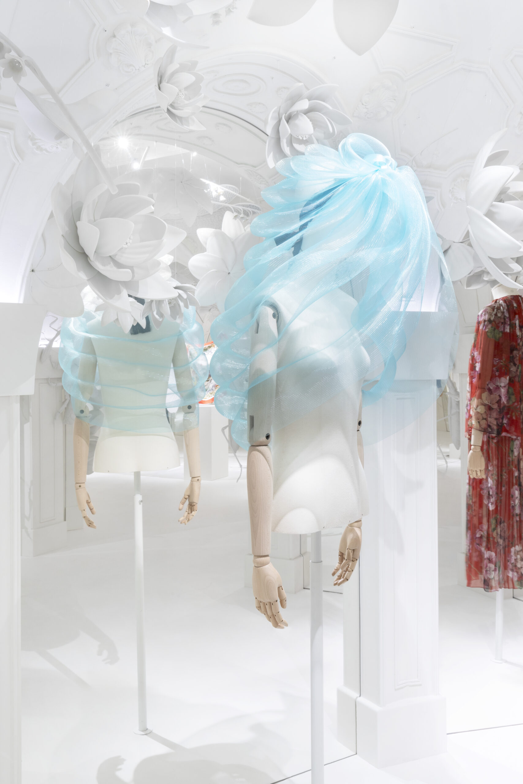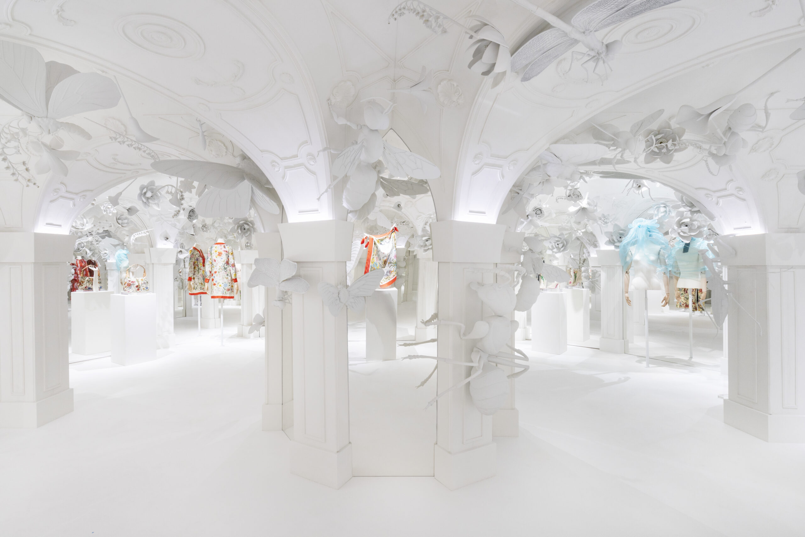 ‘Eden’, the next world in Gucci Cosmos, brings to life the tale of Flora, an exquisite and delicately naturalistic image of plants and fauna from 1966. Commissioned by Rodolfo Gucci from acclaimed Italian artist and illustrator Vittorio Accornero de Testa for a silk scarf created for Princess Grace of Monaco, it became the leitmotif for Gucci’s 1981 ready-to-wear collection, presented in the Sala Bianca, in Florence’s Palazzo Pitti and has since ignited the artistry of Tom Ford, Frida Giannini, Alessandro Michele and Sabato De Sarno. Within the light- and mirror-filled circular space of ‘Eden’, with its feeling of being inside the vaults of a Florentine palazzo, Gucci’s ongoing relationship to the diversity and beauty of the biosphere is symbolized in an installation of larger-than-life white sculptures of flowers and insects featured in Accornero’s design. These are suspended above key archive pieces that reveal Flora’s constant ability to inspire. Embodying how the elegant pattern has been used, reused, and remixed are a gloriously hypnotic Flora-print silk minidress from 1969, a 2008 Frida Giannini floral print dress created for a Gucci Flora fragrance campaign, Alessandro Michele’s signature embroidered shearling-lined denim jacket with its ‘L’Aveugle Par Amour’ motto, a floral print ‘Jackie’ bag from Spring Summer 1999 by Tom Ford, and a series of silk scarves and fabric bags. The visitor is accompanied through ‘Eden’ by a soundtrack of brushstrokes, water drops, and a voice reciting all the different colours featured in the Flora design, as if it were Accornero talking to himself as he painted.