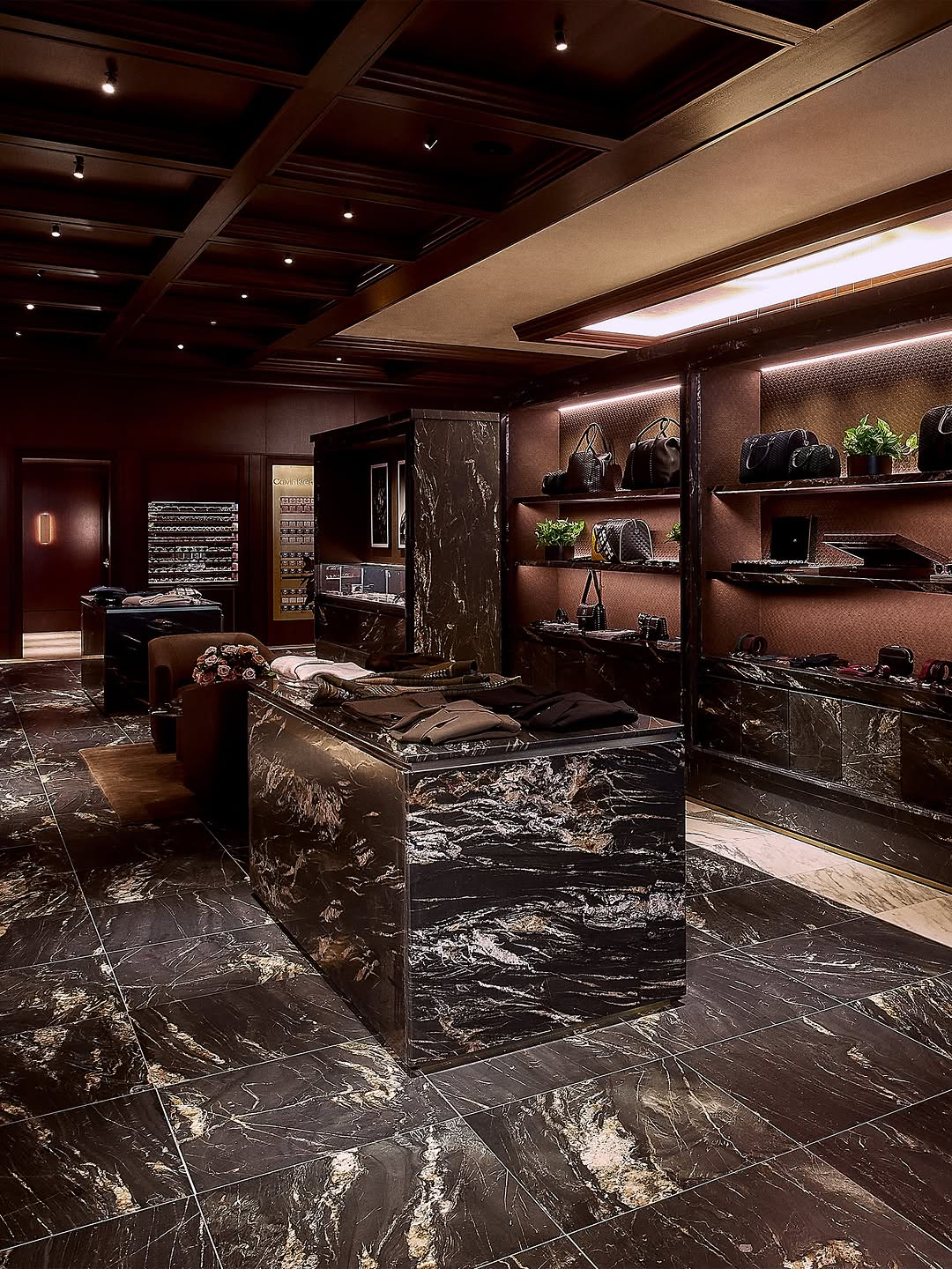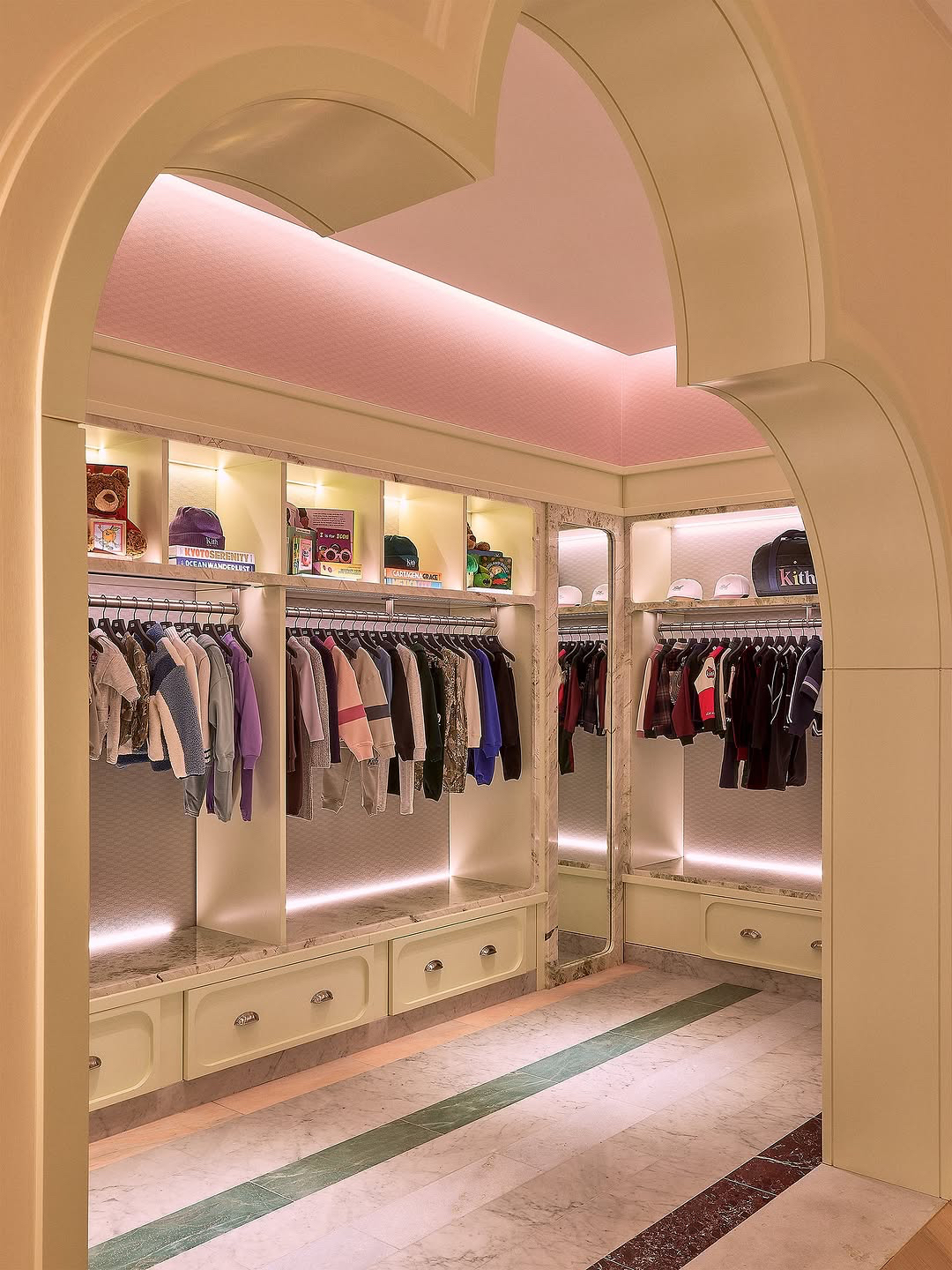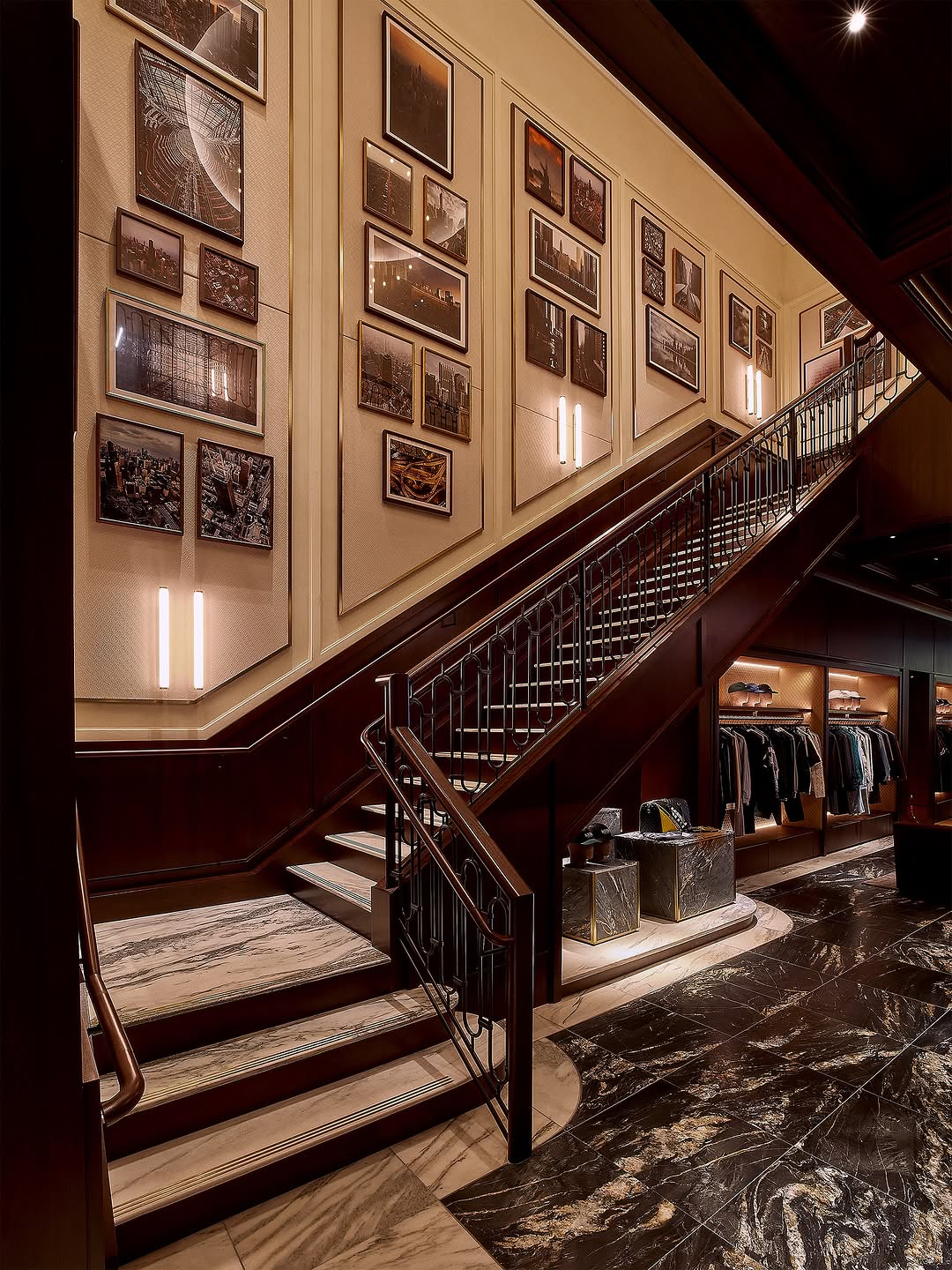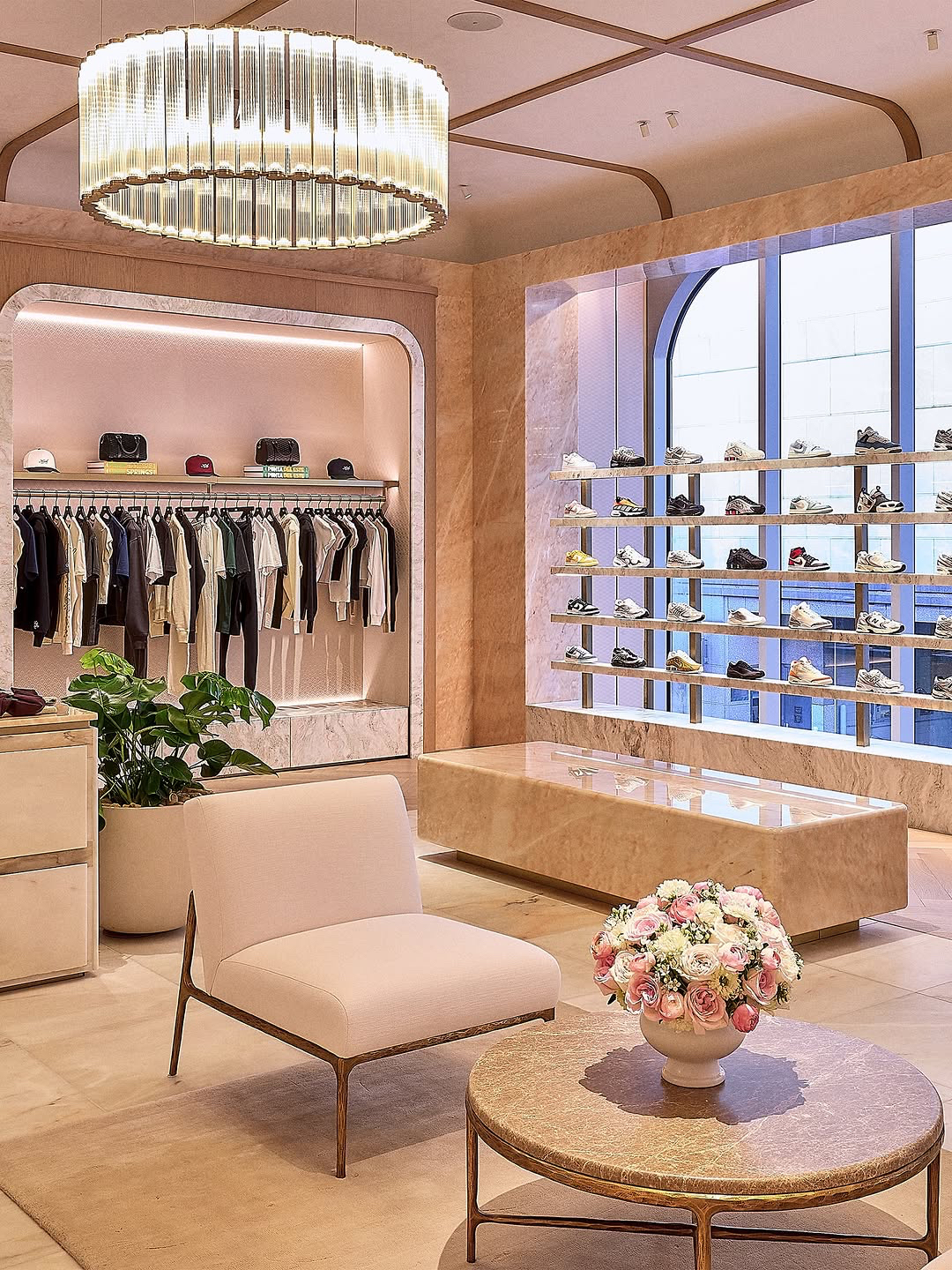 Designed by Ronnie Fieg in collaboration with Ben Porto of Porto Architecture, the two-story space makes a strong architectural statement with a leathered Belatrix Stone façade framed in brass. Inside, the design balances contrast: the men’s floor features dark walnut millwork and Belvedere stone, while the women’s and kids’ level is defined by Rosa Aurora Macchia Vecchia marble and a custom helix chandelier.
