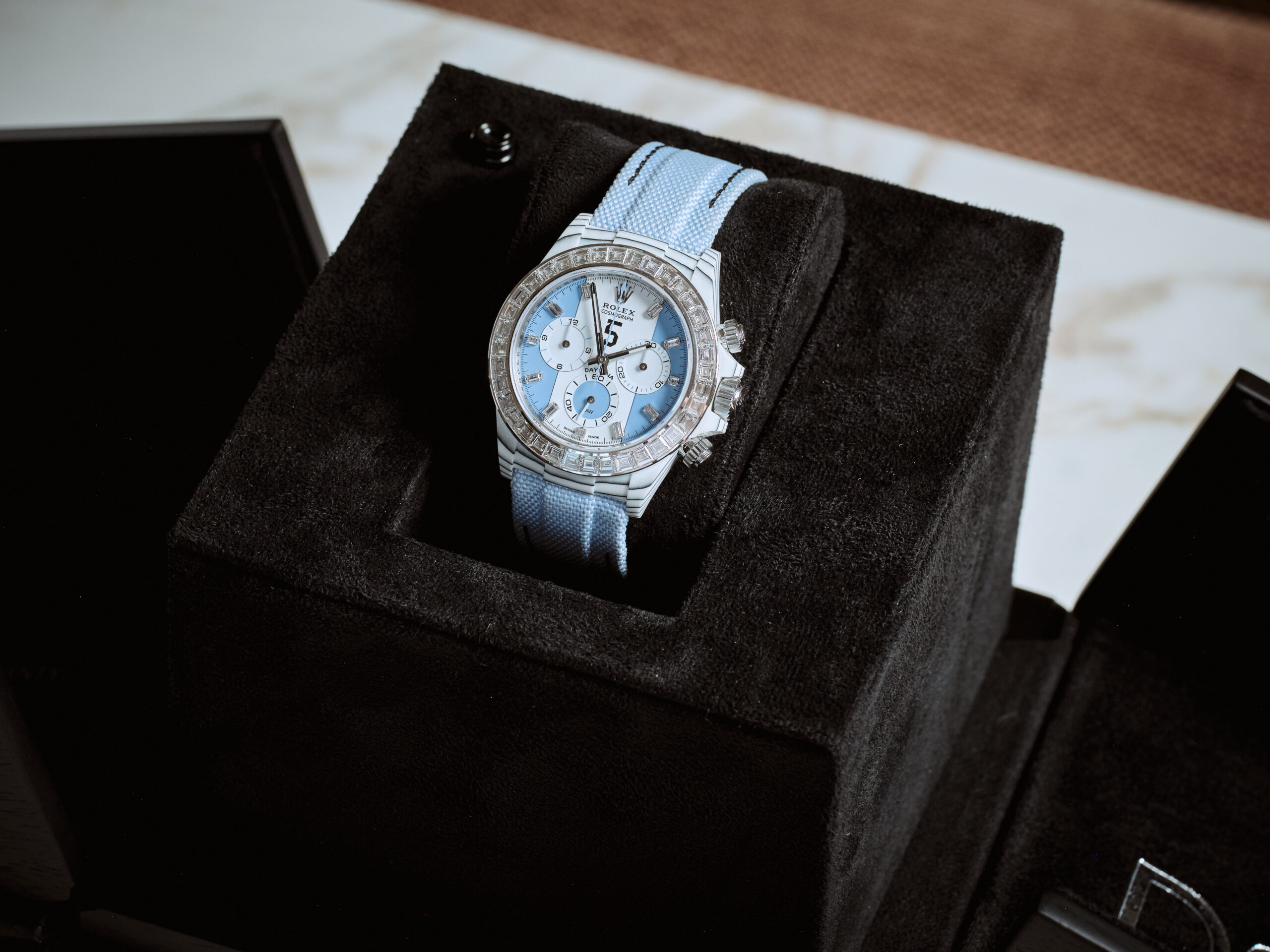 In celebration of that momentous achievement, DiW and Leandro have come together to create a one-of-one Rolex Daytona bearing the iconic blue and white of Argentina, Leandro’s squad number, and name etched in the case.