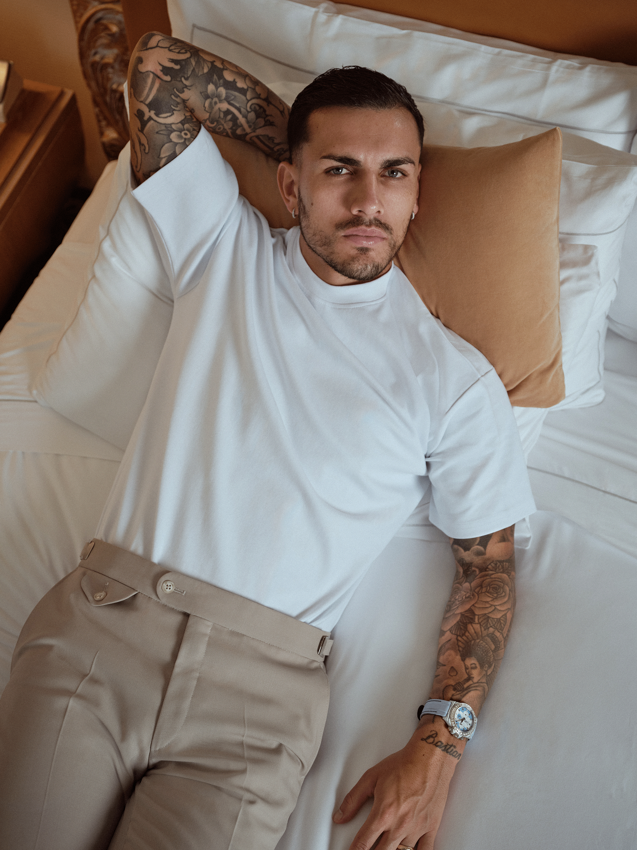 Leandro’s awareness of the fleeting nature of life is undeniable, a sentiment he reinforces with a meaningful tattoo just above his neckline.