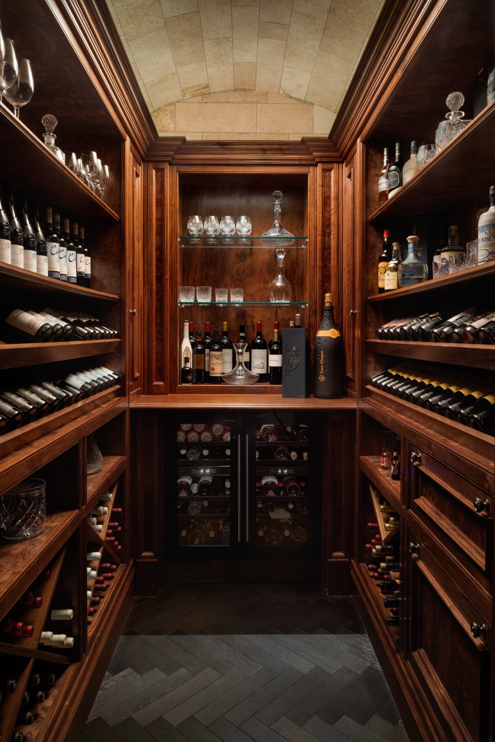 An unmissable space within the home is the long and narrow vault downstairs that was transformed into a wine cellar. Inspired by the client’s second home in Spain, finished with Clive Christian Furniture’s Architectural range in a Cool Walnut finish, the room combines steelwork, bespoke cabinetry and complex custom carpentry with modern lighting across the lengths of the floor to light up and lift the entirety of the space for a spellbinding effect.