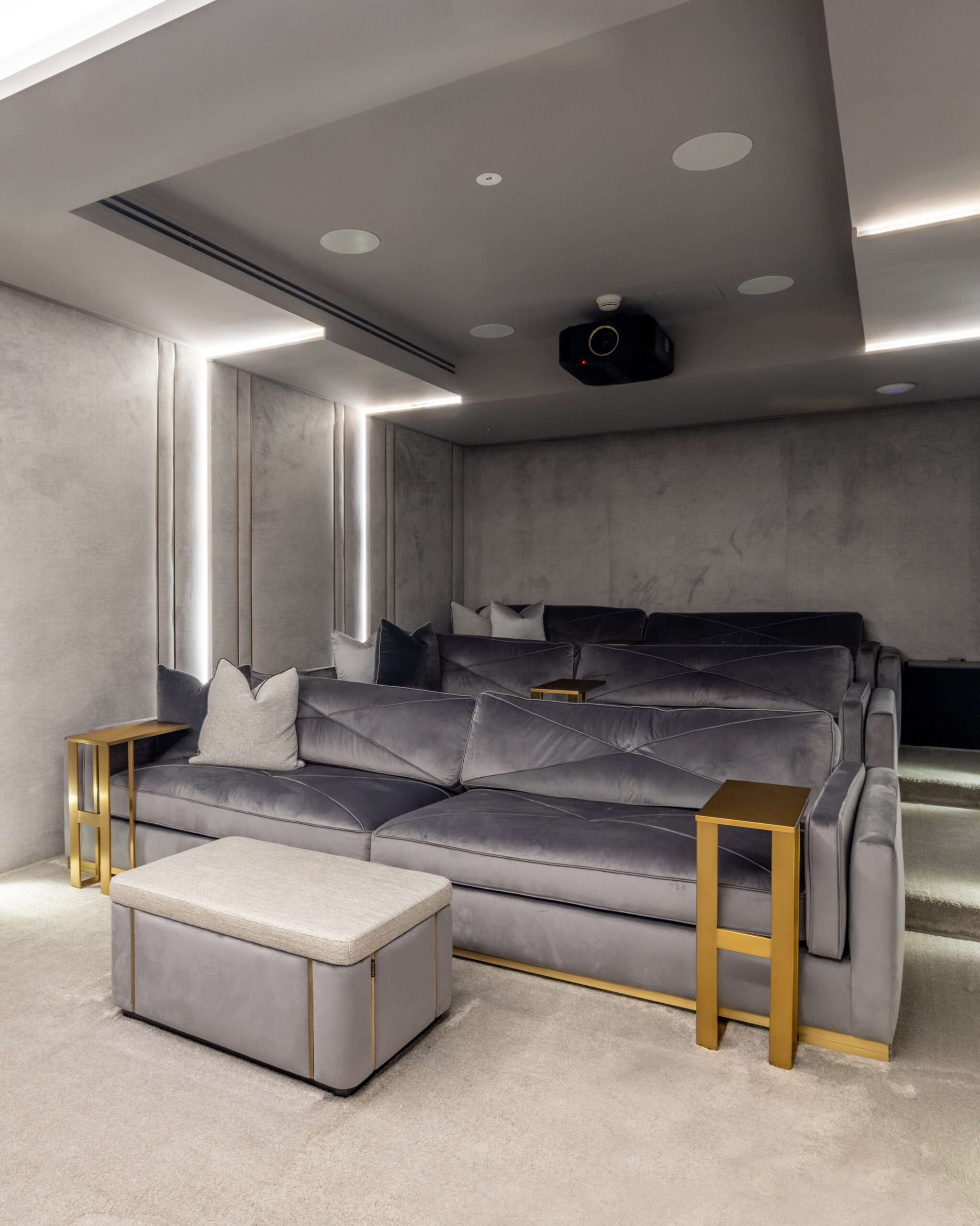 For smaller gatherings or family occasions a more intimate living room allows for cosy conversation amongst beautifully curated interiors featuring specially chosen furniture which exudes comfort and style. A luxury basement cinema and media room created to allow for further entertaining or family movie nights in an area dedicated to relaxation – with cosy seating and laidback luxury vibe.