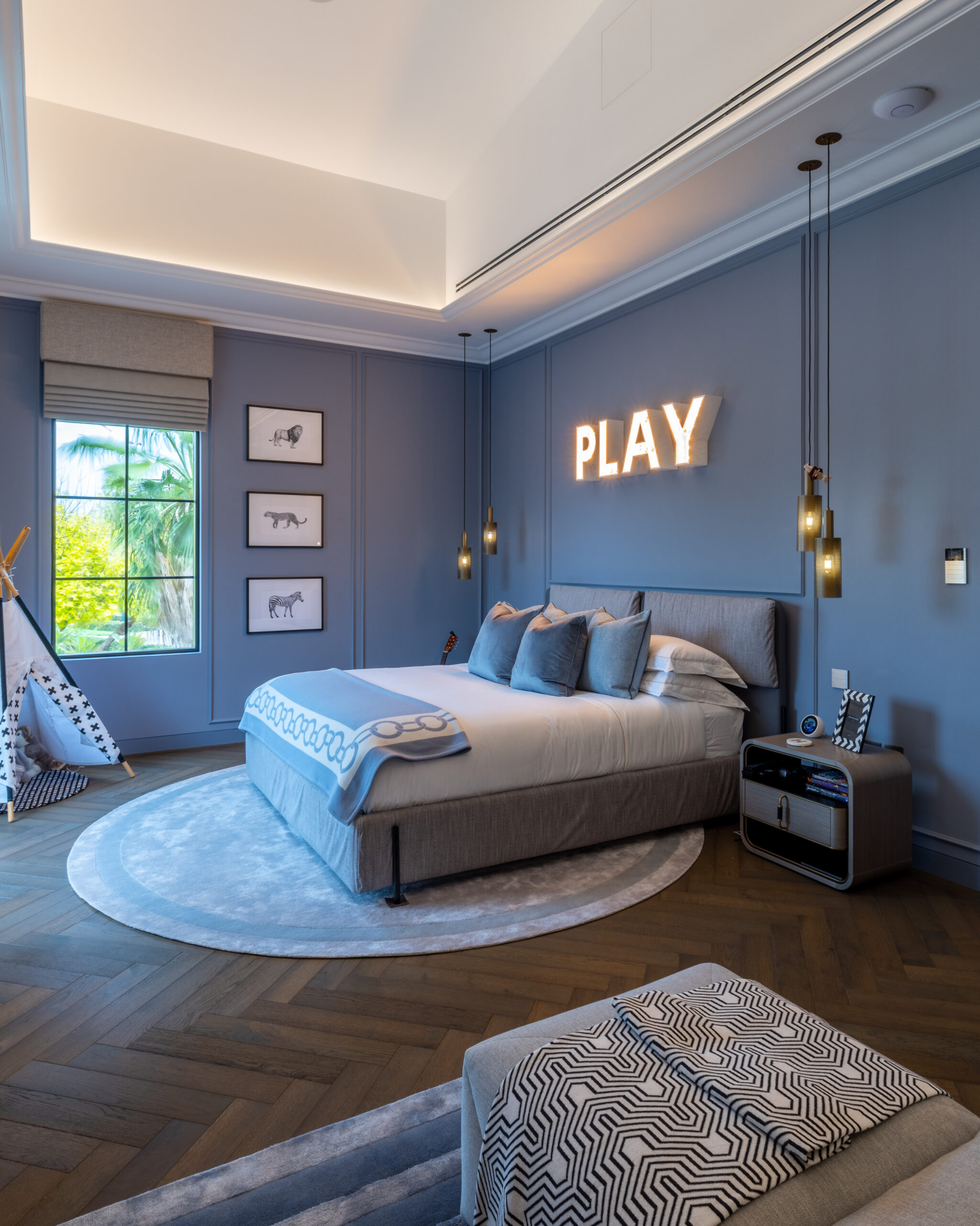 Further guest bedrooms and bathrooms are similarly appointed with the very best in comfort and style with a boutique hotel feel while the children’s bedrooms were designed to be able to see younger ones through to teen years while still incorporating playful aspects. With input from the children, Oir included custom artwork of a special car to be stencilled onto the bedroom wall and bespoke lighting to add a fun vibe.