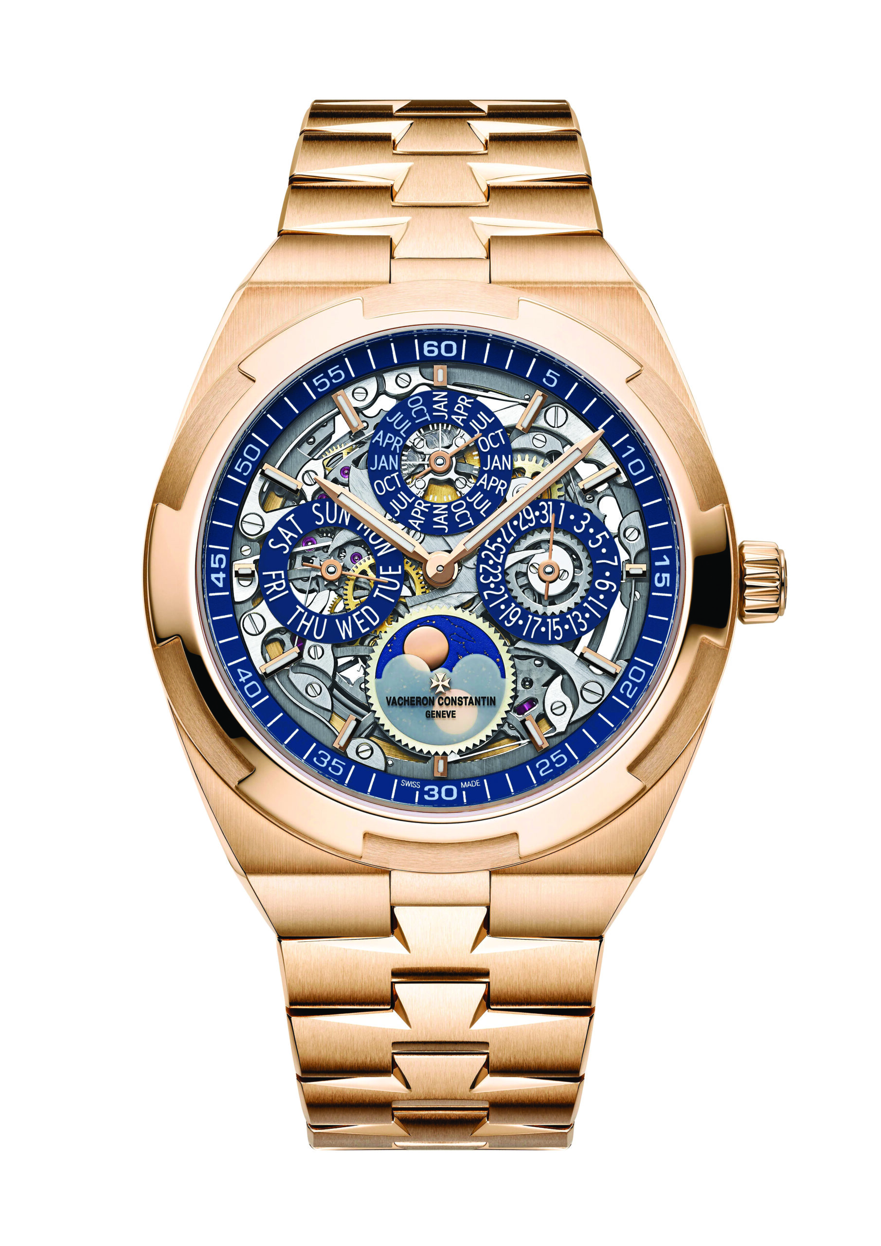 This new skeletonised interpretation in 18K 5N pink gold with a blue dial expands the realm of possibilities. Acknowledged for its technical and innovative character, the model won the Calendar and Astronomy Watch prize at the Grand Prix d’Horlogerie de Genève in 2020. In order to keep track of the Gregorian calendar’s distinctive features, a perpetual calendar must be equipped with a mechanical memory of 1,461 days, taking the form of a cam on which, the different monthly durations are duly programmed. The mechanism can thus indicate without any need for correction months of 28, 30 and 31 days, as well as leap years. On the Overseas perpetual calendar ultra-thin model, the day and date display along the horizontal axis is complemented on the vertical axis by the month indication across four years, while the moon-phase indication is symmetrically positioned at 6 o’clock beneath an opaque glass. The next adjustment of the date will only take place in 2100, a secular year divisible by four but not by 400 and therefore not a leap year – another singularity of the Gregorian calendar.