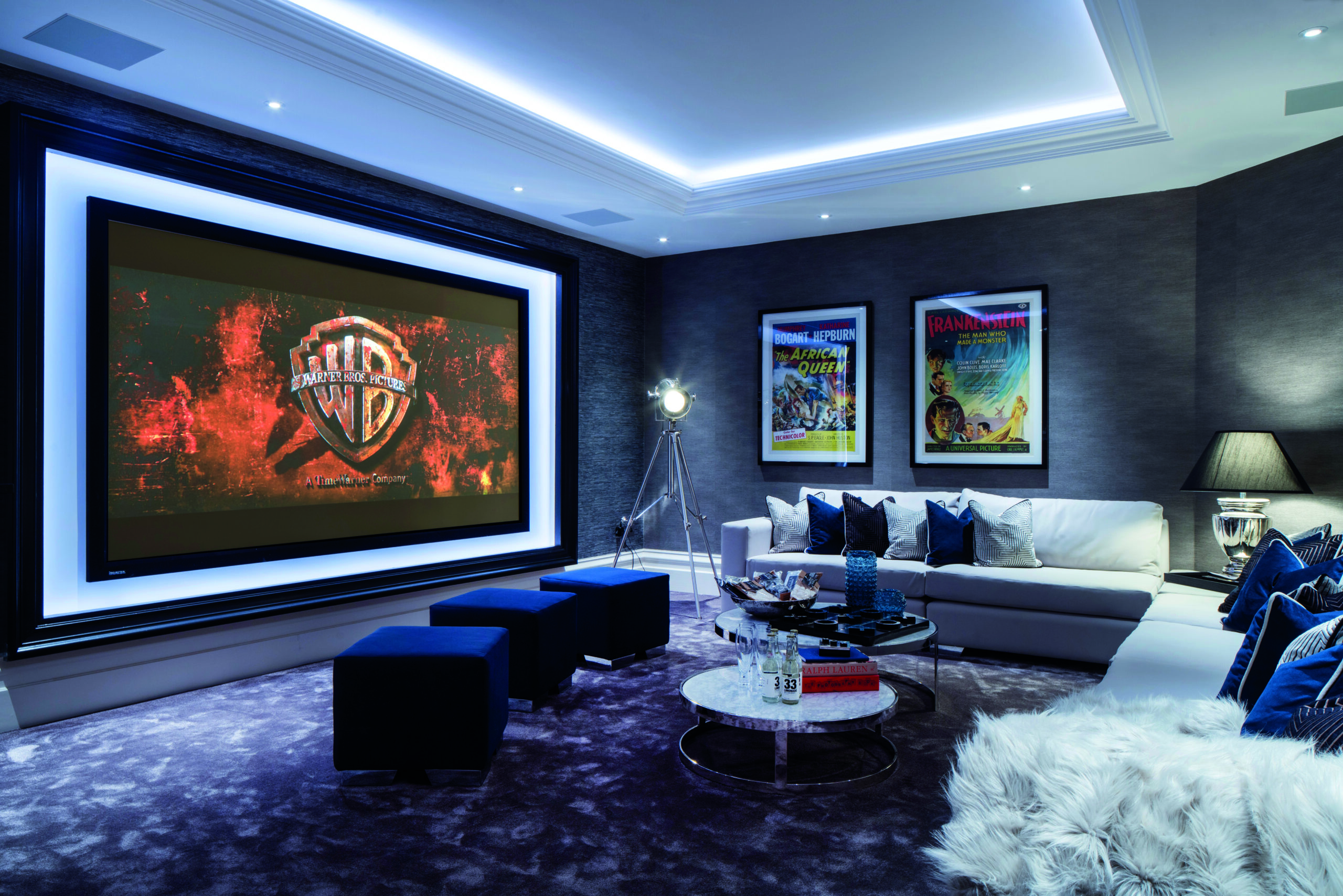 When designing the scheme for the cinema room, we were keen to make sure it felt like a room to be used every day, not just for watching the occasional movie. We designed a large, bespoke corner sofa in a soft dove-grey nubuck with chunky chrome feet. This opens the space up to accommodate a pair of white marble topped coffee tables on polished stainless-steel bases, and a set of three midnight blue stools. The final touch is the vintage movie posters framed on the wall, adding an additional bit of character as well as a splash of additional colour in the room.