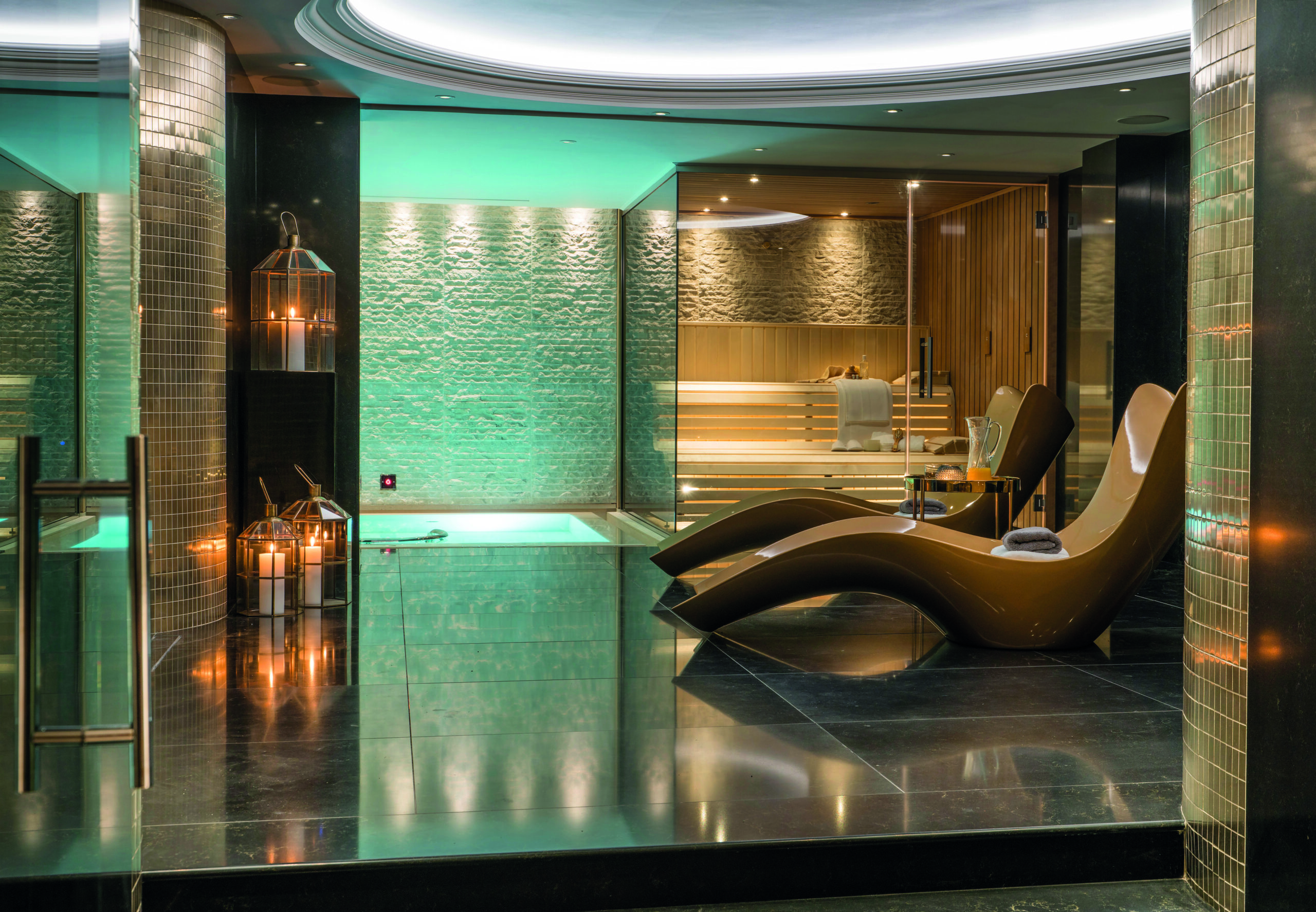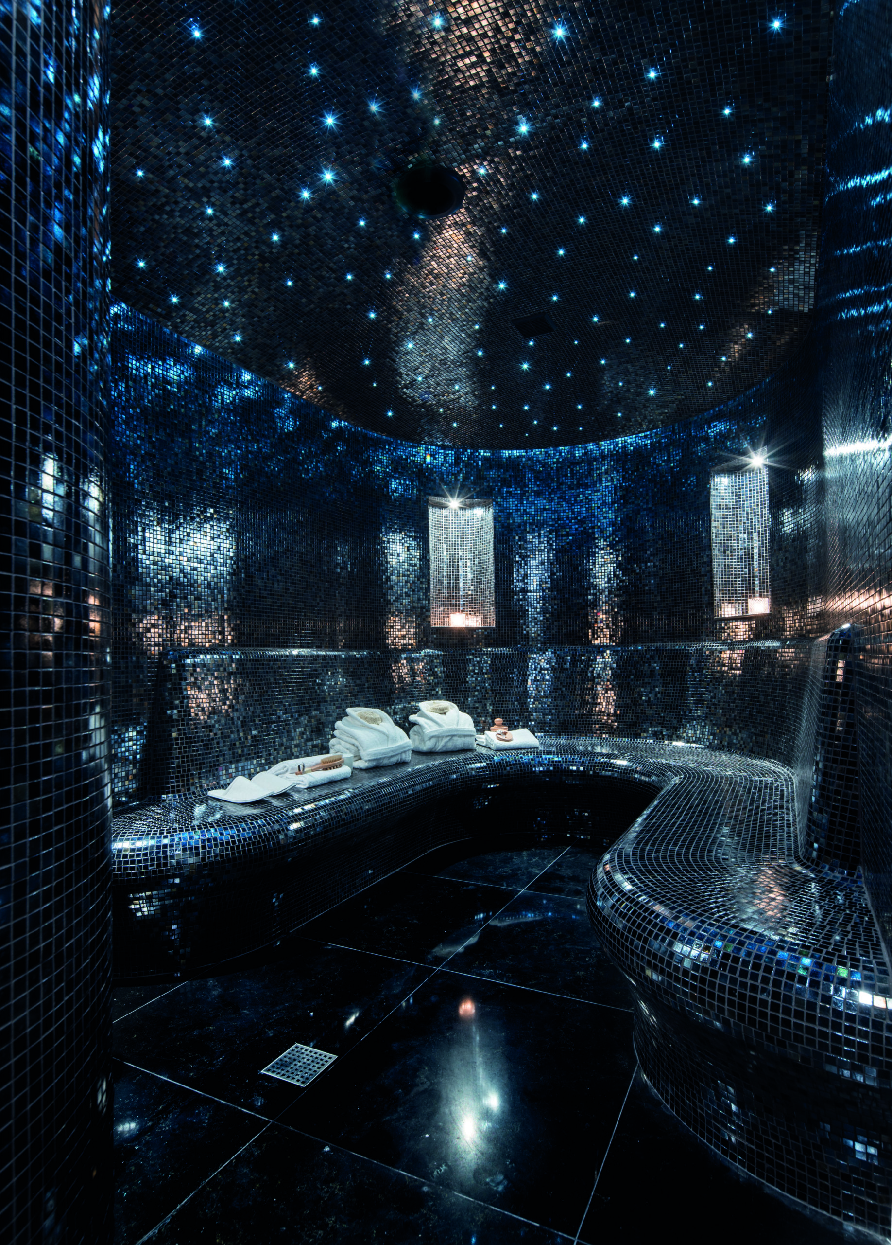 The spa, in elegant black and gold, is designed to provide the utmost in luxury. Located ideally in the basement, between the gym and the cinema room, it is a superb space for entertaining. The raised, oval coffered ceiling with hidden lighting casts an elegant and soothing glow across the spa. The lack of harsh light provides the perfect atmosphere for such a setting.