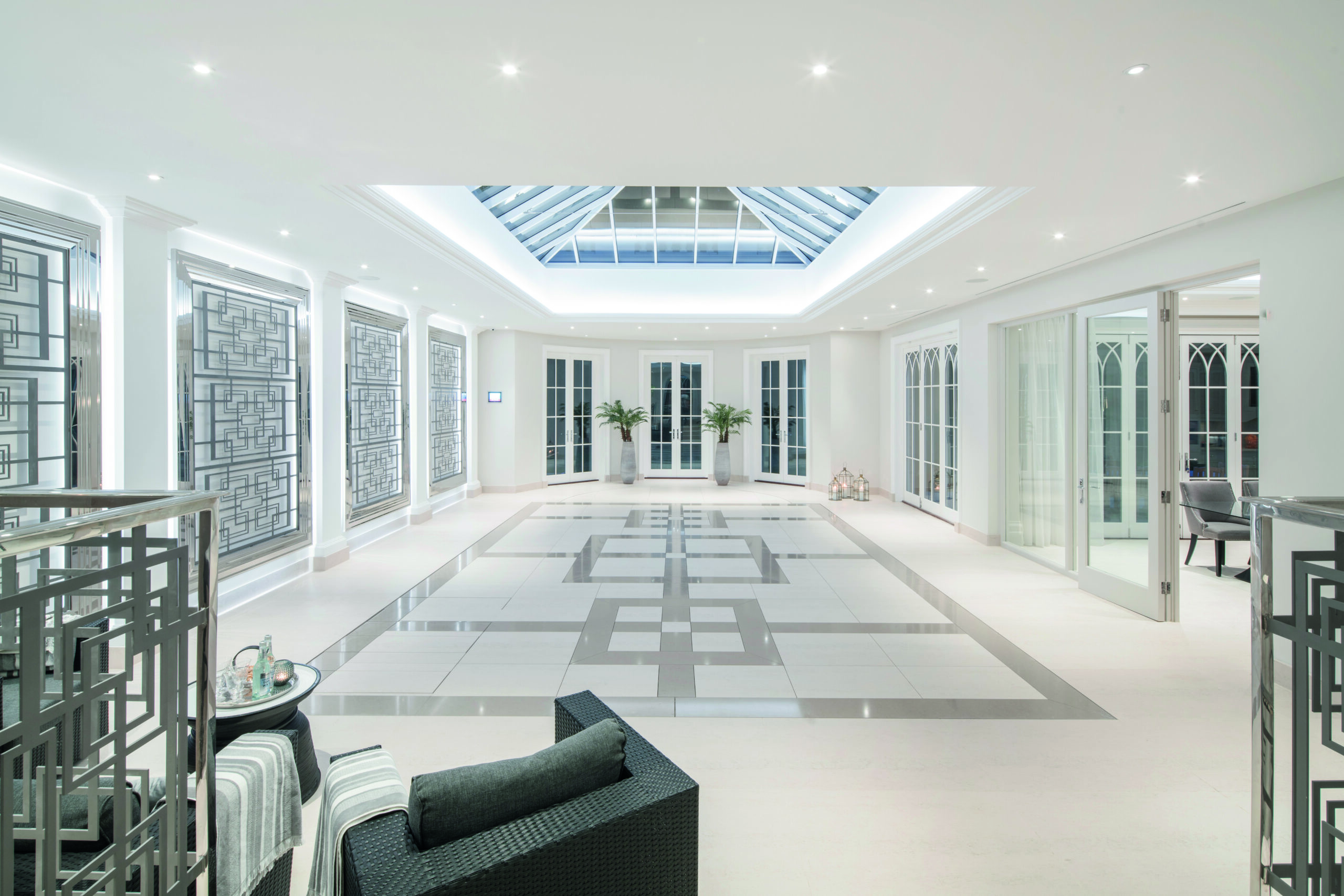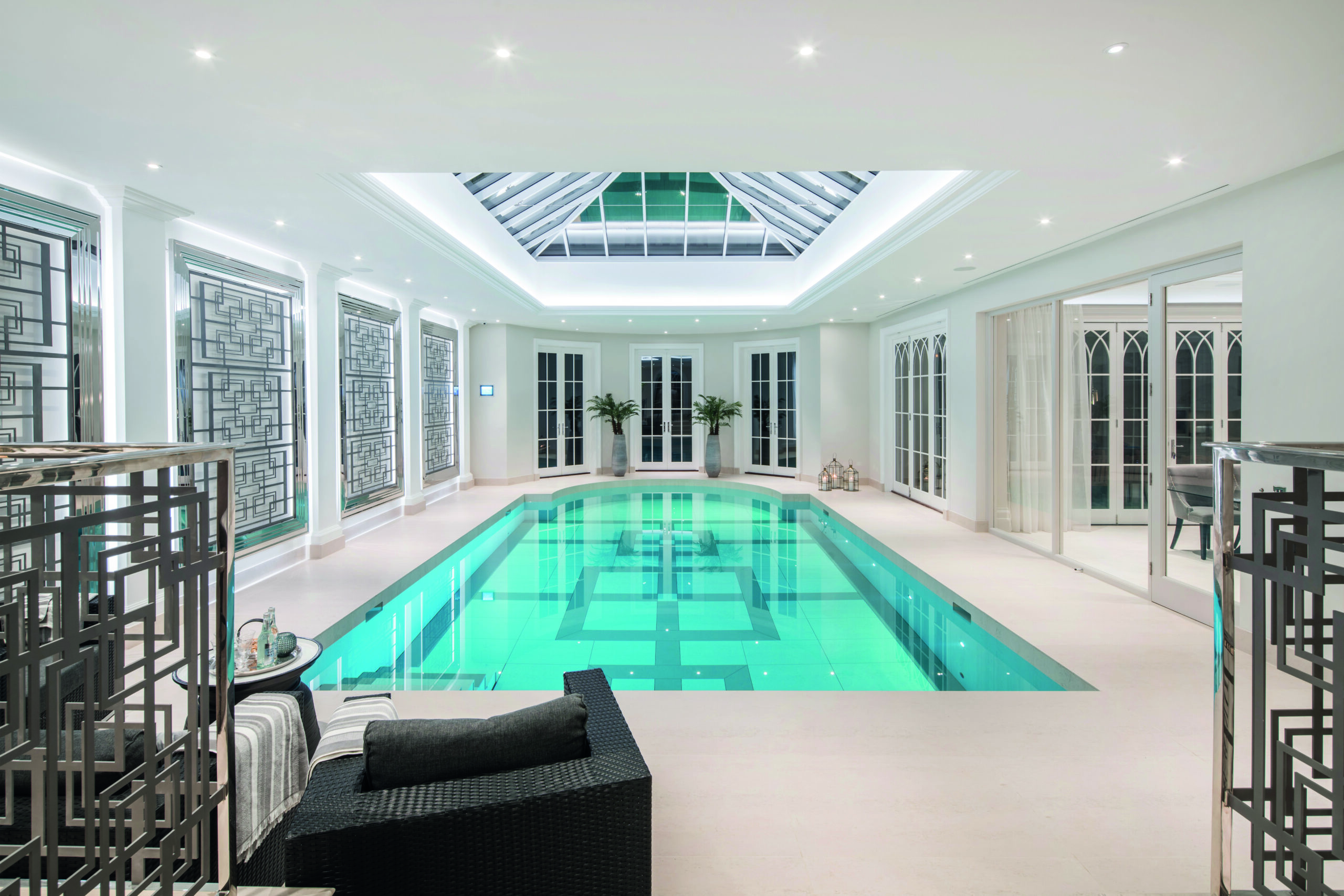 The property features a large hydraulic swimming pool with a rising floor. This provides a space that can be completely versatile, either as a swimming pool, or an entertaining function room/ballroom. With a switch operated, stop-start system the floor can be adjusted to different depths. In the entrance hall and pool areas, the flooring features a beautiful design with the inspiration originating in the pool room. We wanted to create an elegant aesthetic feature so that when the floor was raised to become the ballroom, it revealed a distinctive dancefloor set to impress guests.