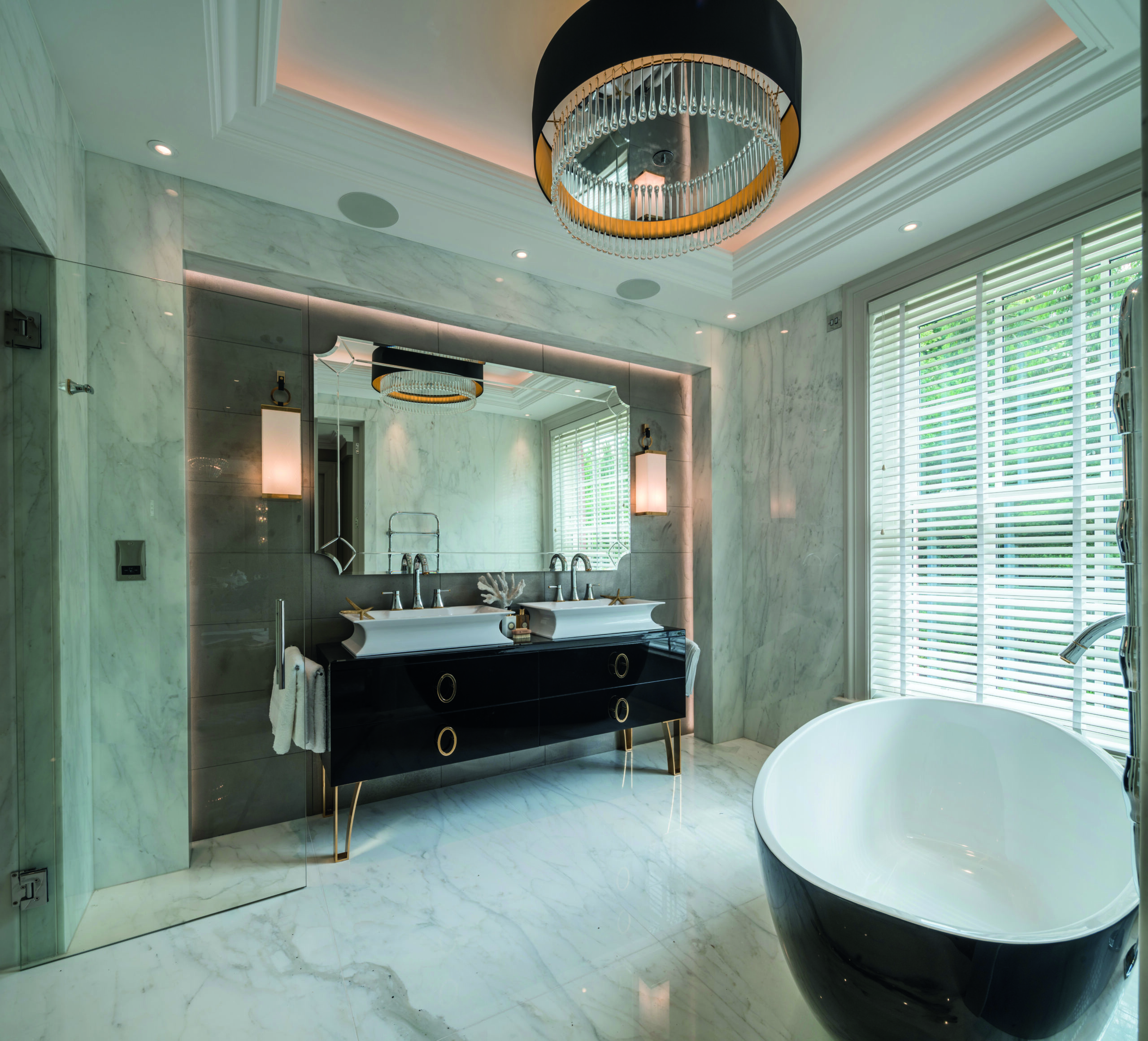 In “her” ensuite, upon the luxurious marble floor stands the double-width vanity unit. In gloss black lacquer, it is contrasted beautifully with gold oval handles and curved legs. Upon this sit two elegantly sculpted basins, the shape of which is synonymous with the bevelled mirror hanging above. The wall in which the vanity unit sits against is recessed to introduce the LED strip lighting around the edges which as it provides an ambient glow, adds to the opulence of the bathroom.